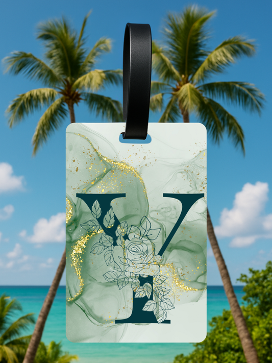 Green Marble Monogram Luggage Tag – Custom Floral Initial Travel Tag