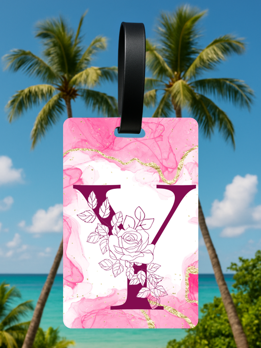 Pink Marble Monogram Luggage Tag – Custom Floral Initial Travel Tag