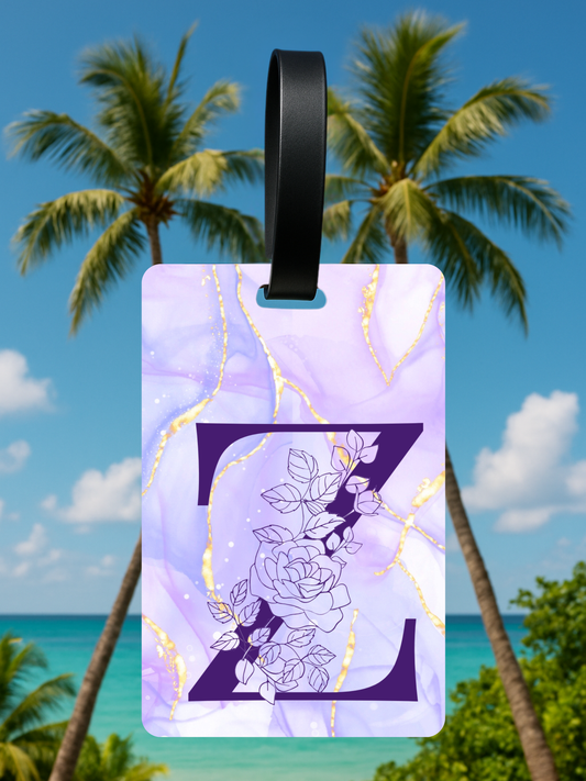 Purple Marble Monogram Luggage Tag – Custom Floral Initial Travel Tag
